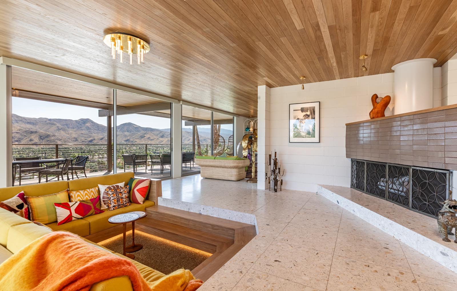 One of the architectural features that Trina added to the home was a unique conversation pit that is centered in the living room in front of the fireplace. Popular in the 1960s, this space allows for uninterrupted sight-lines out to the spectacular view below the house, while offering a new perspective on the ever-changing light and landscape and a cozy place to watch a winter fire.