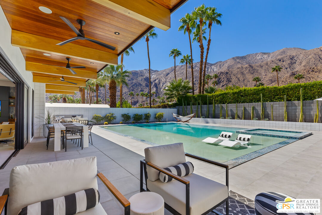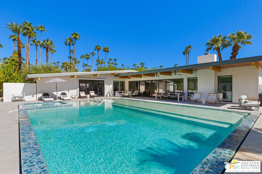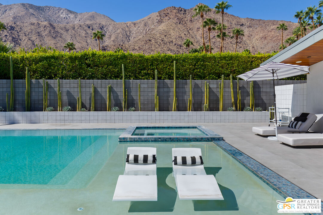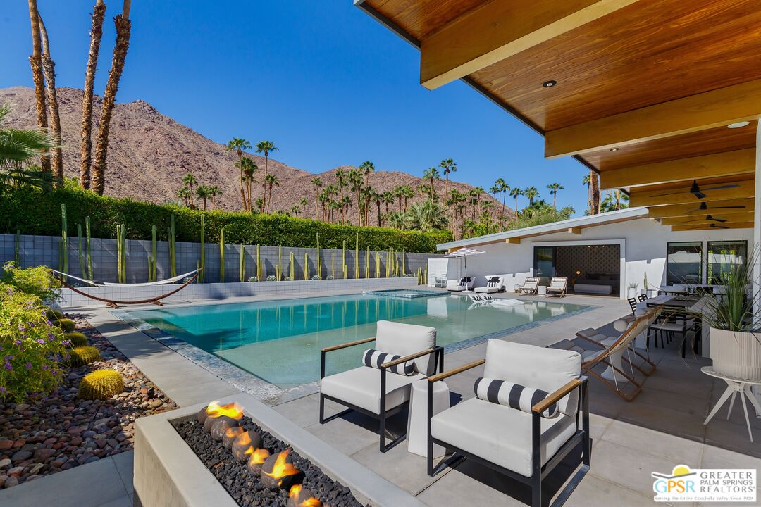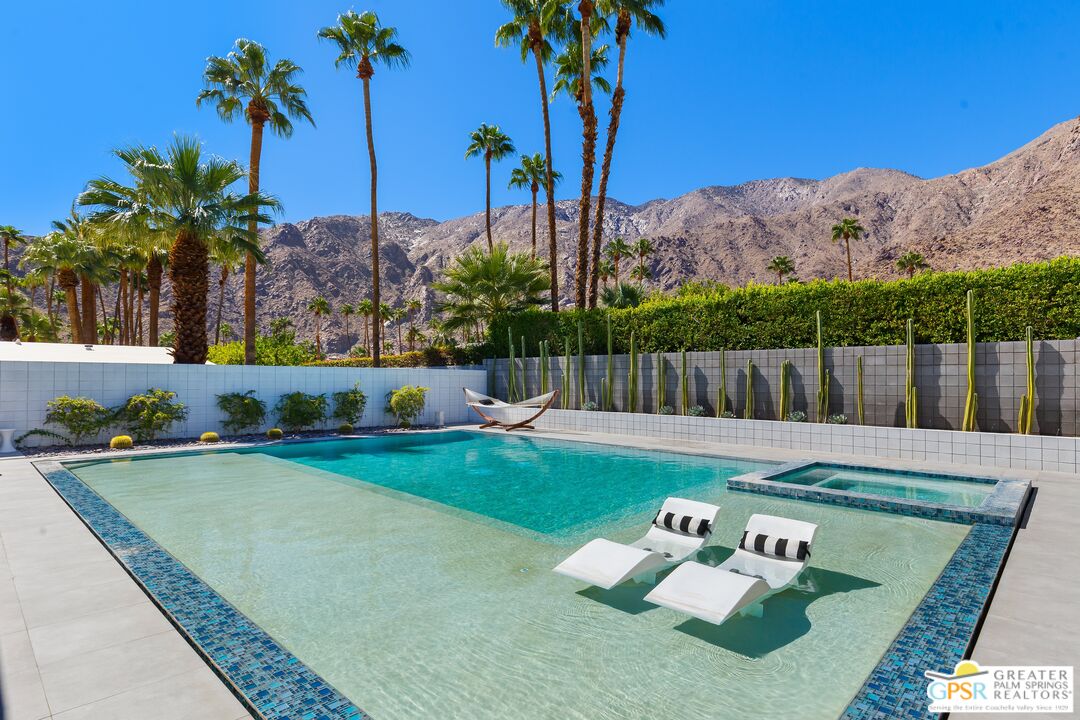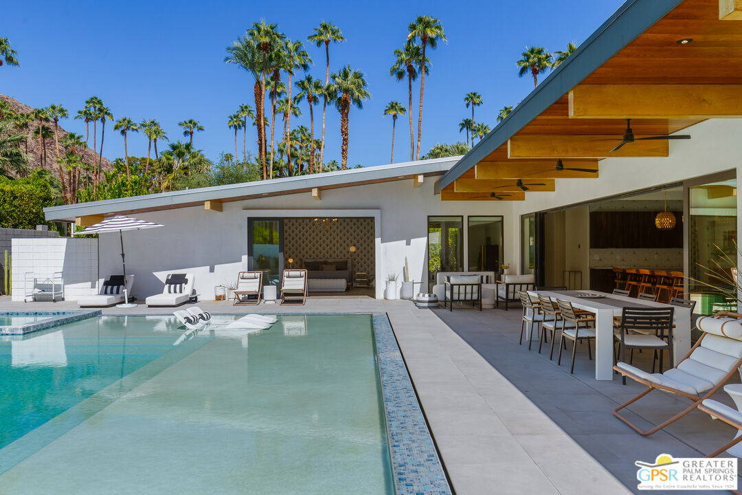 A rare blend of provenance and polish, this is classic Palm Springs style elevated. An original 1961 Alexander Company home, extensively renovated and reimagined. Authentic, clean mid-century lines honor its true architectural history. The floor-to-ceiling glass with a bright open layout showcases the spectacular, south and west facing mountain views from the main living areas. Timeless architecture meets modern comfort, featuring crisp finishes and a seamless indoor-outdoor flow that is ideal for desert living. Step inside to discover a beautifully appointed interior featuring stone and tile floors, illuminated by elegant chandeliers and recessed lighting. The expansive floor plan includes 4 bedrooms and 4.5 bathrooms. Three bedrooms are ensuite with walk-in showers and elevated finishes. The property features a chef's kitchen with Walnut cabinetry and high-end appliances. The large honed island anchors the kitchen and is perfectly located for indoor and outdoor living through the large stacking exterior doors. The smart home features will make everything a breeze with automatic blackout shades and integrated audio, lighting, and multi-zoned AC. Having owned solar panels with new doors and windows helps create a comfortable and efficient home. Outside, the private yard has large protective wood-clad overhangs complete with a 4-sided saltwater infinity pool with a heating and cooling system, an elevated spa, and a large tanning shelf. Enjoy evenings by the fire pit or relax on the private patios with mature landscaping. Patios off each bedroom are the perfect private places for family or guests to unwind and take in the views. This Modernism Week show home is a rare gem in one of the most coveted neighborhoods of Palm Springs.