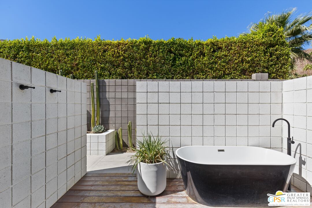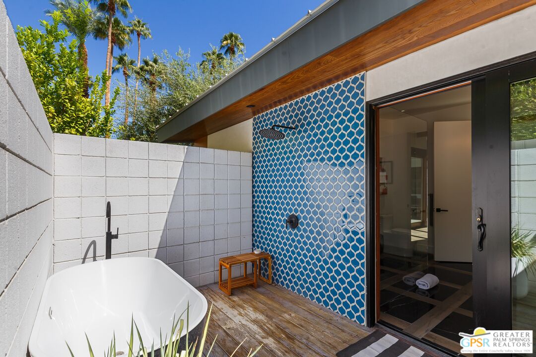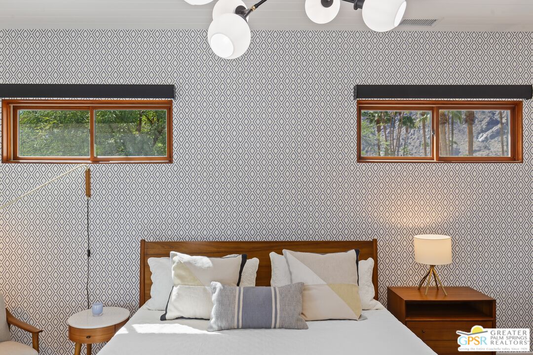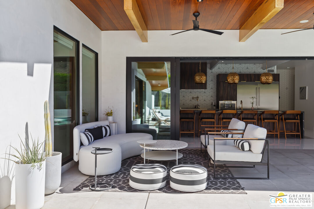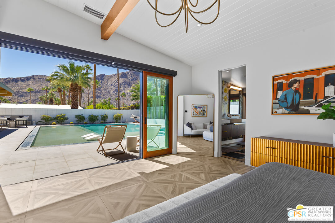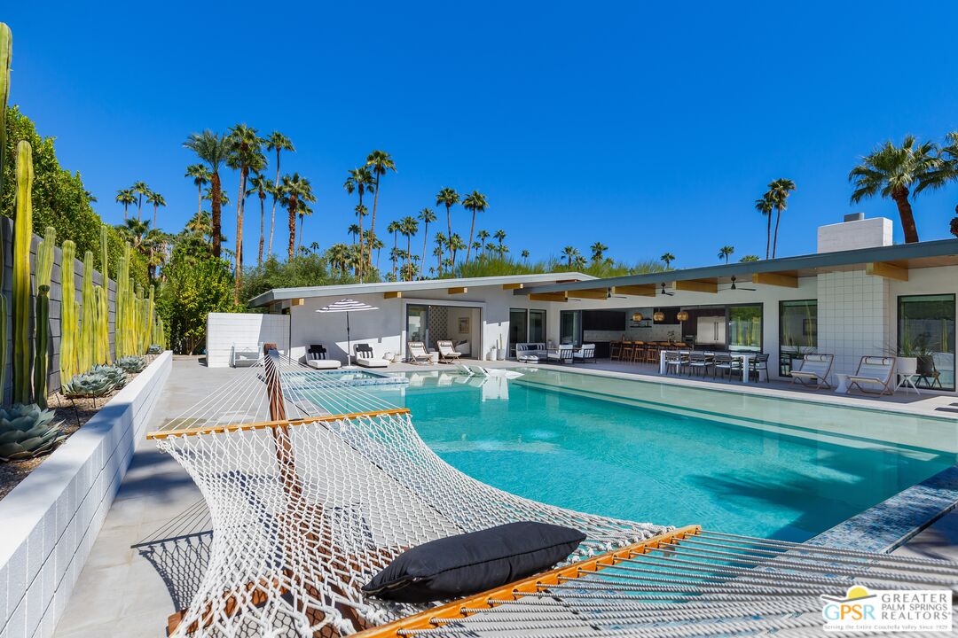 A rare blend of provenance and polish, this is classic Palm Springs style elevated. An original 1961 Alexander Company home, extensively renovated and reimagined. Authentic, clean mid-century lines honor its true architectural history. The floor-to-ceiling glass with a bright open layout showcases the spectacular, south and west facing mountain views from the main living areas. Timeless architecture meets modern comfort, featuring crisp finishes and a seamless indoor-outdoor flow that is ideal for desert living. Step inside to discover a beautifully appointed interior featuring stone and tile floors, illuminated by elegant chandeliers and recessed lighting. The expansive floor plan includes 4 bedrooms and 4.5 bathrooms. Three bedrooms are ensuite with walk-in showers and elevated finishes. The property features a chef's kitchen with Walnut cabinetry and high-end appliances. The large honed island anchors the kitchen and is perfectly located for indoor and outdoor living through the large stacking exterior doors. The smart home features will make everything a breeze with automatic blackout shades and integrated audio, lighting, and multi-zoned AC. Having owned solar panels with new doors and windows helps create a comfortable and efficient home. Outside, the private yard has large protective wood-clad overhangs complete with a 4-sided saltwater infinity pool with a heating and cooling system, an elevated spa, and a large tanning shelf. Enjoy evenings by the fire pit or relax on the private patios with mature landscaping. Patios off each bedroom are the perfect private places for family or guests to unwind and take in the views. This Modernism Week show home is a rare gem in one of the most coveted neighborhoods of Palm Springs.