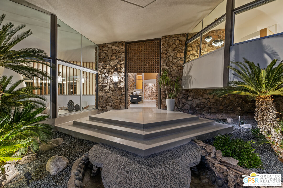 The Alexander Residence 1960 - William Krisel architect. Prolific Southern California developers and society patrons Robert Helene Alexander of the Alexander Construction Co. commissioned the spaceship-like dynamic winged home as there personal residence, a testament to engineering and daring avant-garde design that attracted Look Magazine in 1962 to declare it The House Of Tomorrow. 1967 the newlyweds Elvis and Priscilla Presley famously leased the house lending it the name The Elvis Honeymoon Hideaway Home. A provocative entry path ushers you into an interior sunken party pad flanked by angular stacked stoned walls, glass, and a low-slung curved upholstered banquet embracing a futuristic shaped fireplace hood and floating hearth. A raised dining platform connects to a custom circular kitchen and private den with fireplace, the grounds unfold seamlessly through a wall of glass to the expansive exterior terracing, pool, and breathtaking mountain views.A lavish primary suite is reached via a grand staircase to a private glassed perch featuring panoramic views. A generous dressing room/bathroom is concealed by built-in wardrobe closets centered around a circular tub, and an intimate balcony is accessible allowing for a discrete observation deck. All bedrooms, three lower and one upper, are en-suite, two sharing an exterior terrace. In 2021 the home went under a thoughtful renovation with restored original architectural details of stone and poured terrazzo floors, bringing the house back to it's original intent and receiving a Class-One historic designation. 2023 brought additional improvements of a higher level of luxury and sophistication. This iconic house is in the Vista Las Palmas neighborhood and is the largest Alexander-built home with the largest pool and best lot. This Special Home Is Being Sold with many of the pieces seen in the photos. Prior to viewing the property, any potential buyer must be qualified with proof of funds or letter of qualification by known financial institution