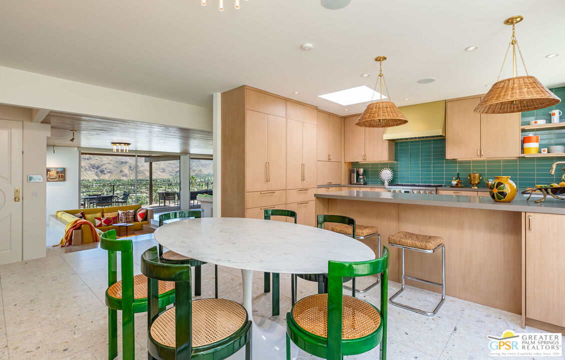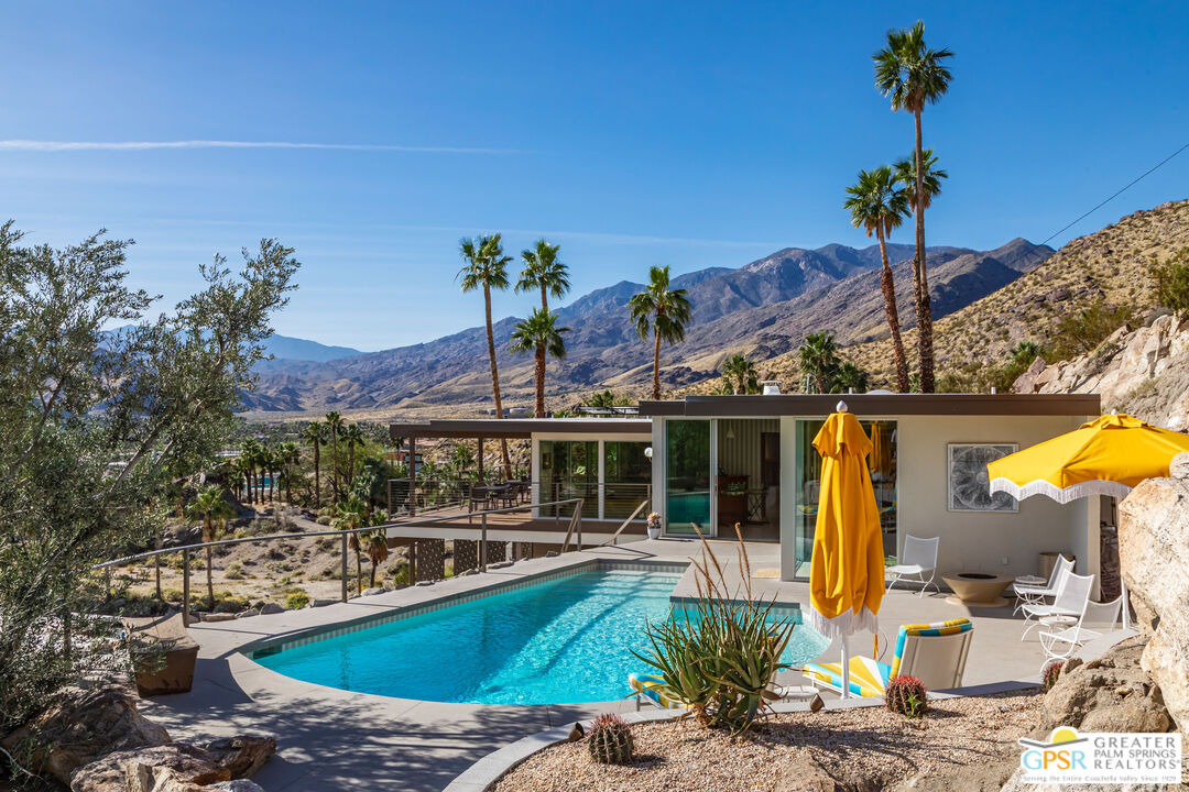 Designed in 1963 by acclaimed Los Angeles architect Harold Bissner, Sr., newly arrived in the desert following a long and distinguished career, the residence was originally commissioned by a local physician and remained in the same family for decades. Recently reimagined by fashion designer and Palm Springs style icon Trina Turk, it has been transformed into the radiant Soleil House. From the moment of entry, the home unfolds as a study in light, material, and horizon. Interior finishes from flooring and tile to wall treatments draw inspiration from the natural palette outdoors, creating a seamless dialogue between interior and landscape. Here, the immediacy of rugged, sculptural terrain meets the vast openness of the valley below, creating a dynamic spatial tension that animates every room. This dialogue is fully expressed in the dining room, where a monumental pane of glass dissolves the boundary between inside and out, pulling the craggy mountainside directly into the interior. With the slightest shift in perspective, the experience transforms from intimate proximity to the boulders to a sweeping, cinematic panorama across the desert floor. At the heart of the living room, a striking conversation pit anchors the space, both intimate and expansive, framing uninterrupted views while offering a warm, grounded connection to the fireplace. Just beyond, a generous deck projects outward, extending the architecture into the landscape and providing a commanding vantage point from which to observe the desert's ever-shifting light, color, and shadow. The floor plan is thoughtfully composed to enhance both privacy and flow. The primary suite is positioned poolside, immersed in light and landscape, while guest bedrooms are discreetly set apart at the opposite end of the home. The kitchen is large and luminous, with a huge picture window capturing the textured hillside and an overhead skylight that washes the space in natural light, an inspiring setting for daily living. Adjacent to the pool, a flexible bonus room offers an ideal retreat for a den, office, or studio. Arrival is both deliberate and architectural: a circular drive leads through a distinctive Trina Turk-designed breezeblock-clad carport, establishing rhythm, pattern, and permeability. Below, a substantial laundry room is complemented by an additional bonus space, well-suited for an office, artist's studio, or fitness room. The comprehensive renovation includes all new plumbing, soft water system, all new electrical systems, a brand-new HVAC system with owned solar, new roof, new doors and windows throughout, and all new kitchen appliances. Exterior improvements include new hardscape, a newly plastered pool with new pool equipment, and landscape lighting. The renovations come with a builder's warranty. The kitchen and all three bathrooms have been completely re-envisioned with a cohesive, design-forward approach. Soleil House is a rare and compelling expression of Palm Springs modernism, where architecture, site, and sky converge in a continuous, immersive experience of space, light, and landscape.