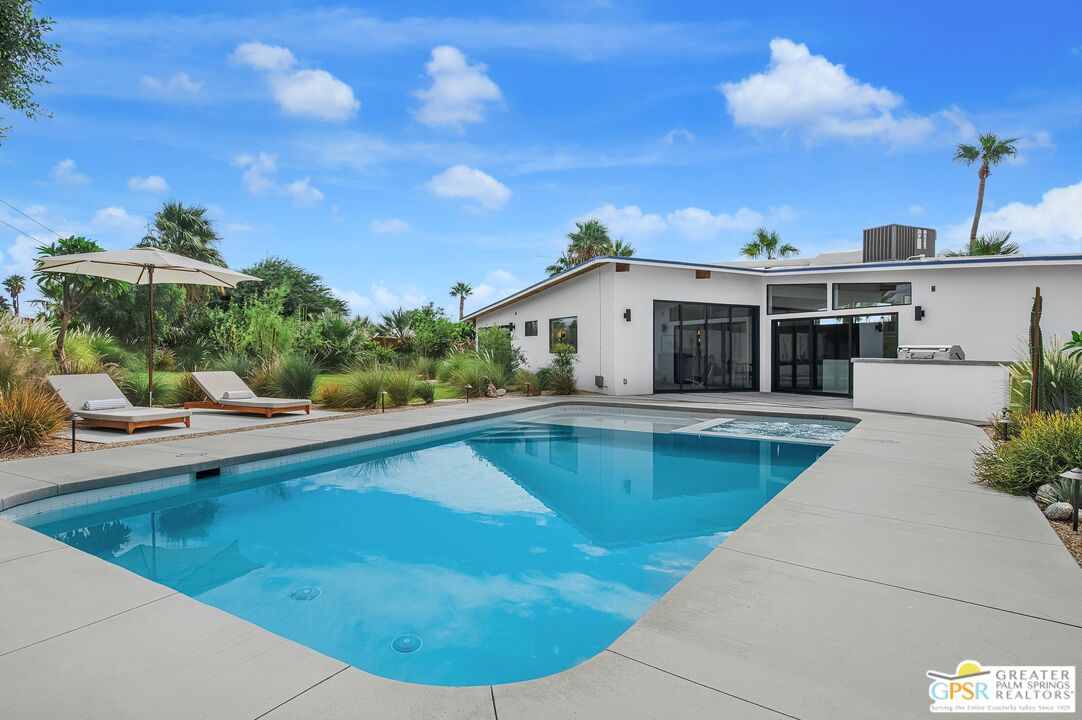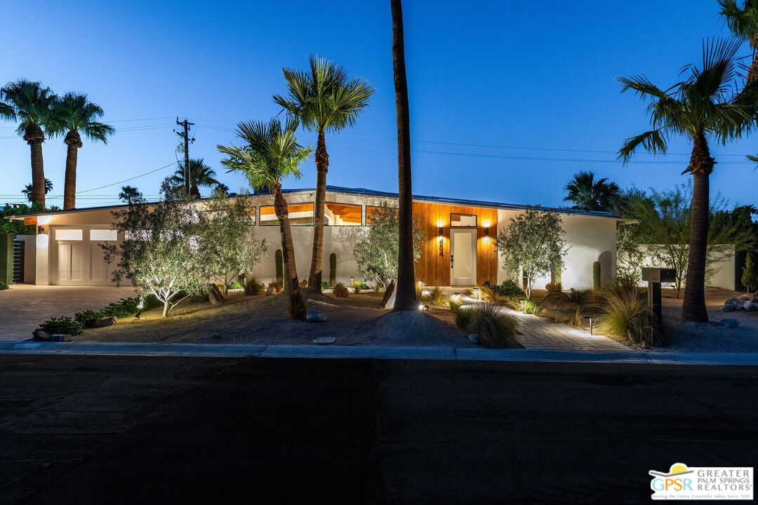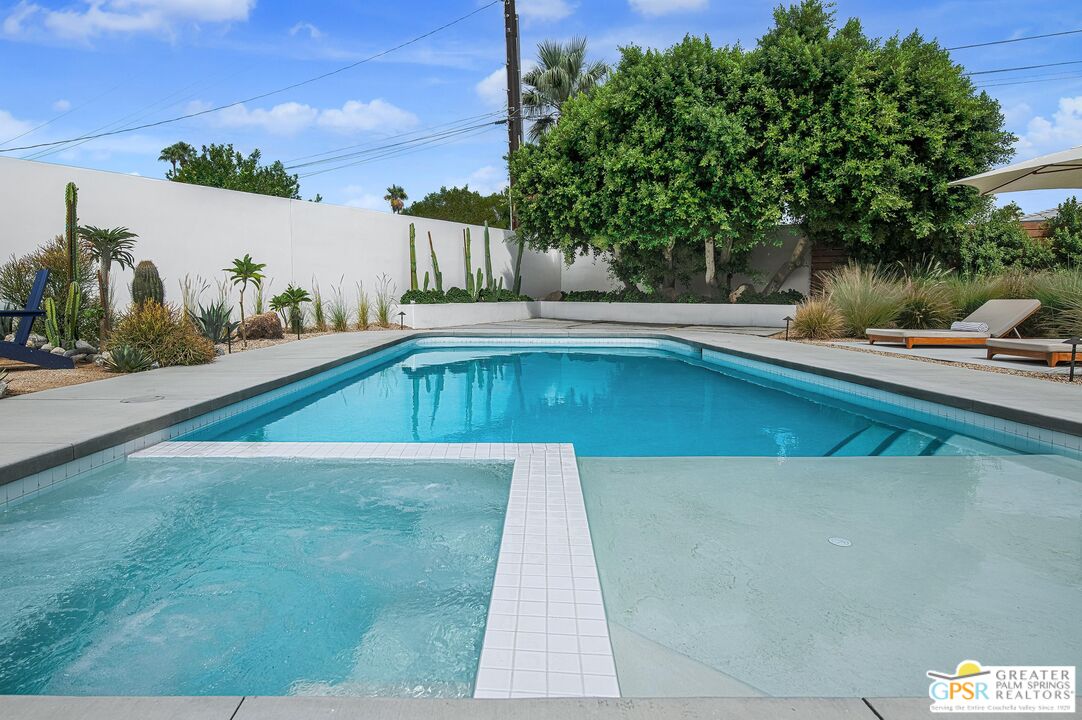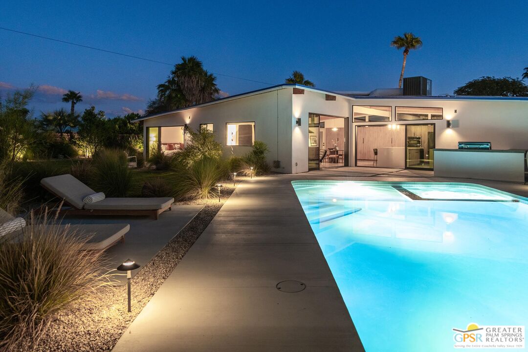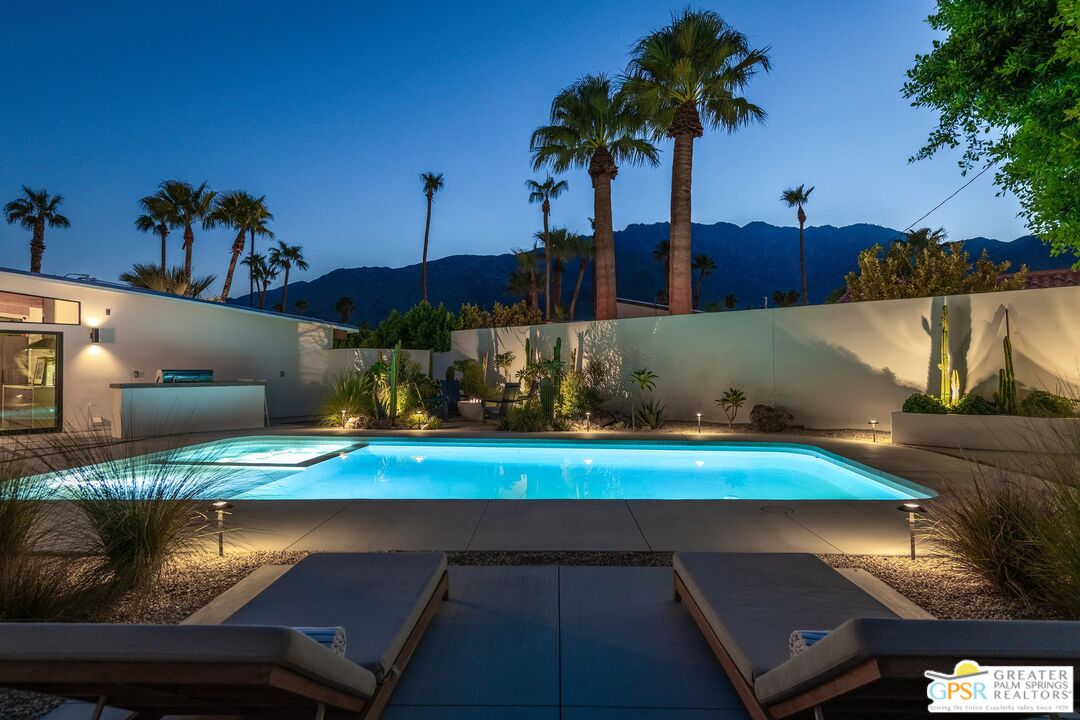 Every detail of this quintessential Palm Springs home has been reimagined with a sense of clarity and intention, transforming it into something distinctly elevated. Ceilings rising over ten feet give the living spaces an airy presence, while clerestory windows frame the San Jacinto mountains and palm tree tops like living works of art. The kitchen anchors the home with a sleek induction cooktop, integrated appliances and tailored cabinetry anchored by a center island. The primary suite opens through glass doors into the gardens, creating an easy rhythm between indoors and out. Its private bath is finished with contemporary tile detailing, while guest rooms share a beautifully designed bath alongside a centrally located powder room. Walls of glass stack aside, opening the home fully to its curated gardens and mountain backdrop with large lot with room for an ADU should you desire. The landscape becomes a private retreat centered on a pool with integrated spa and tanning shelf, complemented by a lounging patio oriented to mountain views, a fire feature with its own seating area and a built-in BBQ for effortless entertaining. With new infrastructure, an enclosed two-car garage with EV charging and grounds that feel organic yet composed, the home offers a crisp, organic expression shaped for life in the desert.