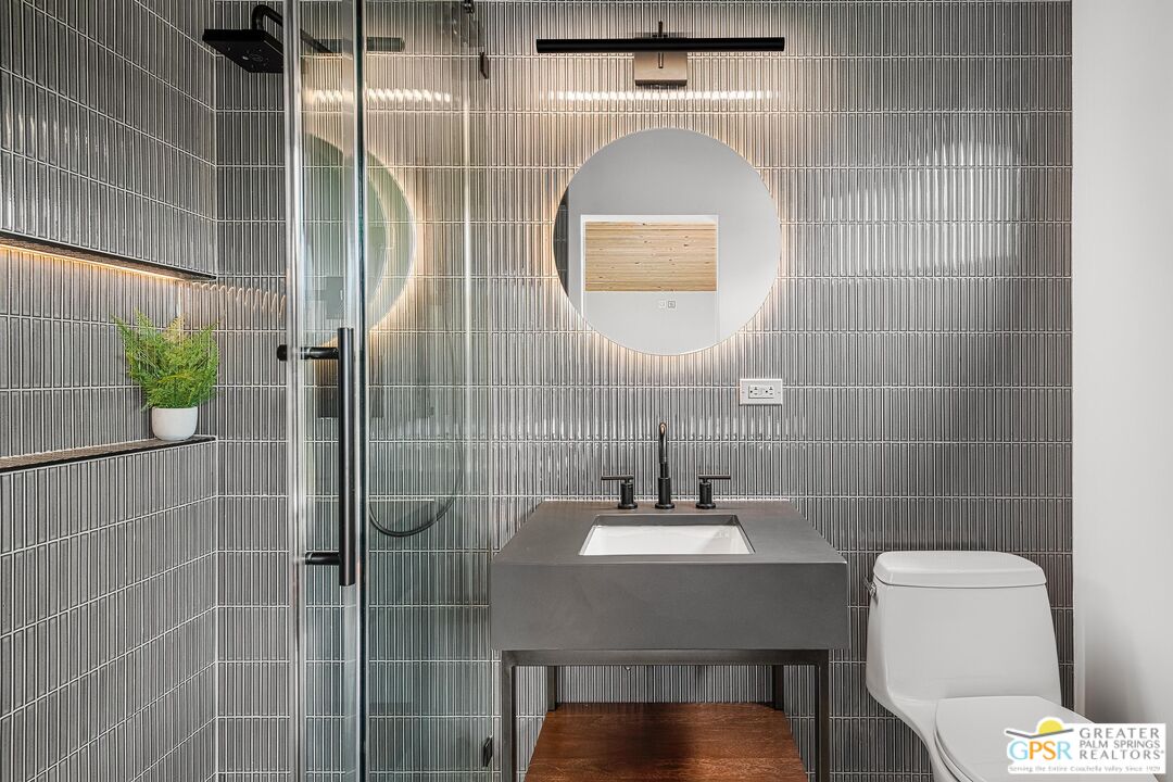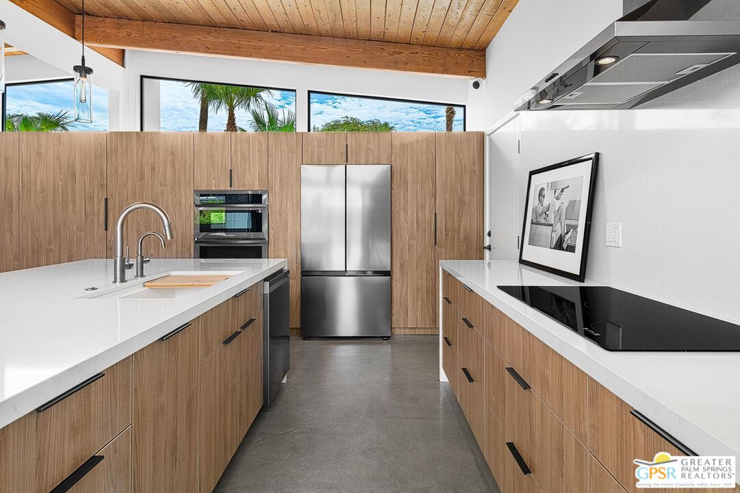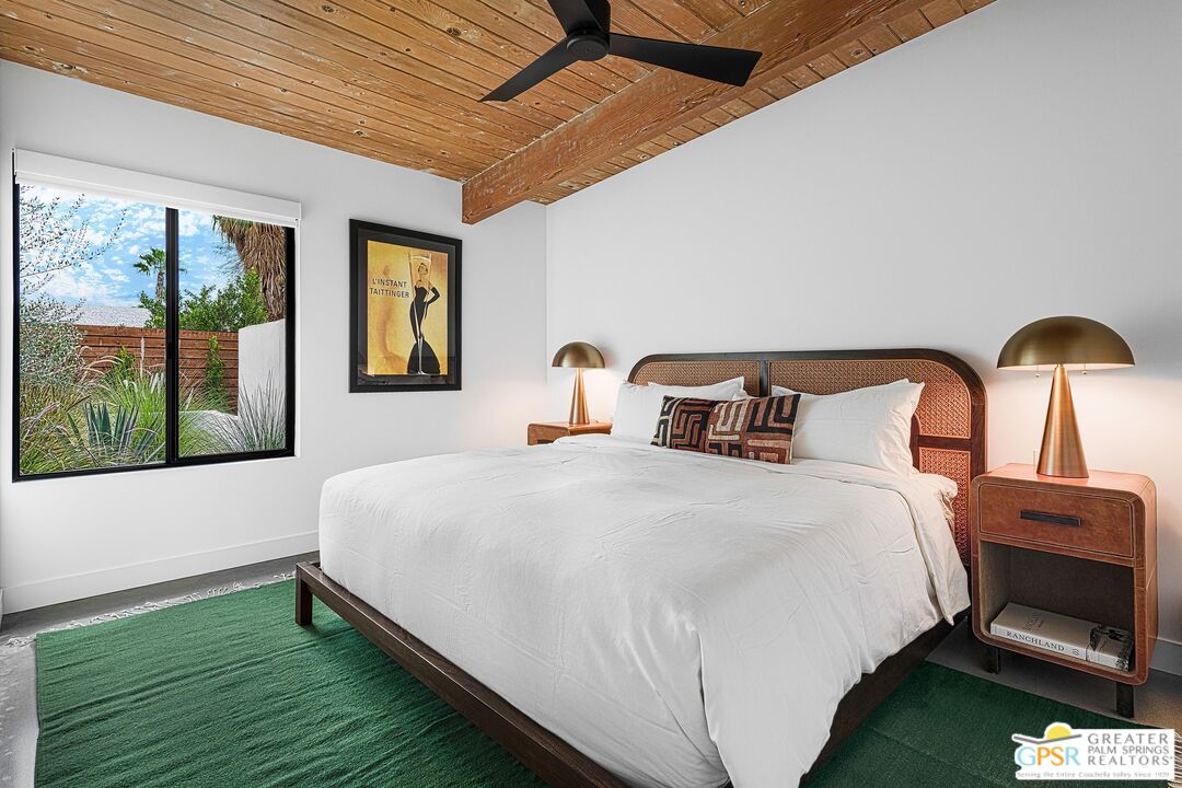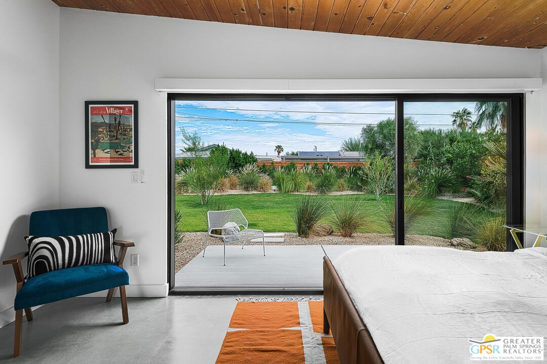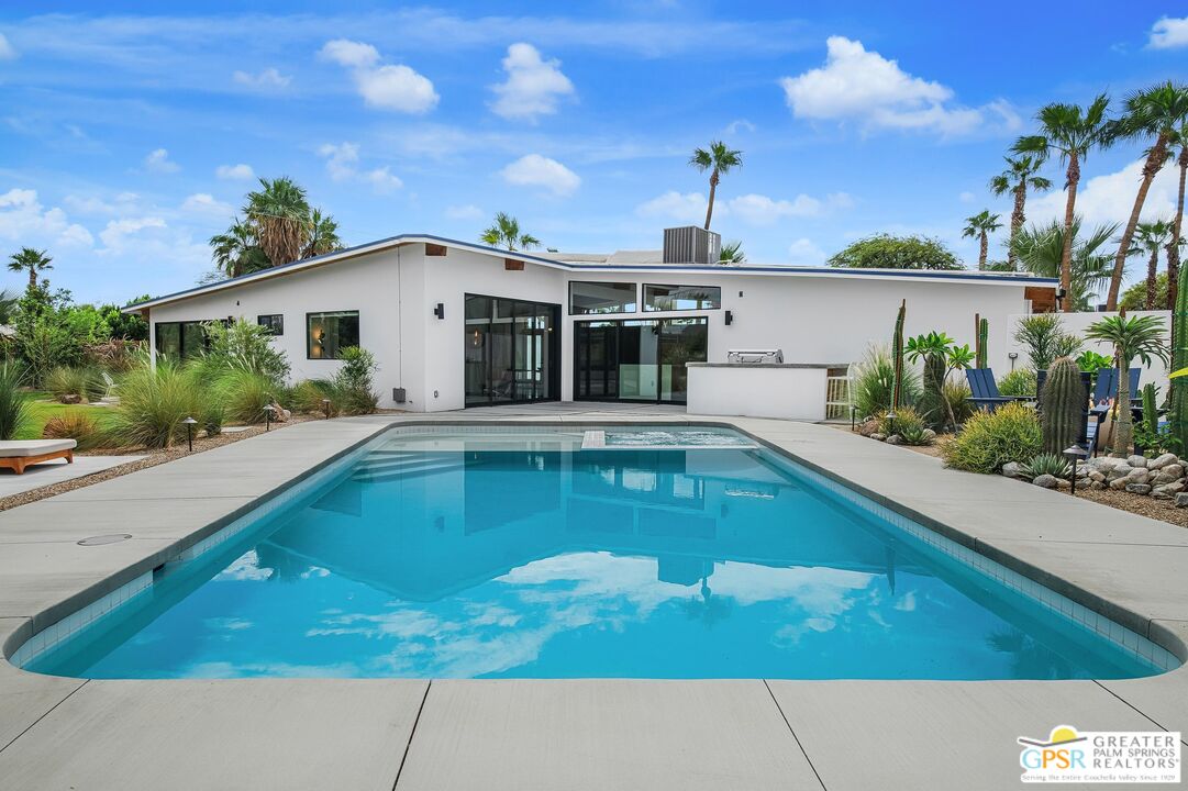 Every detail of this quintessential Palm Springs home has been reimagined with a sense of clarity and intention, transforming it into something distinctly elevated. Ceilings rising over ten feet give the living spaces an airy presence, while clerestory windows frame the San Jacinto mountains and palm tree tops like living works of art. The kitchen anchors the home with a sleek induction cooktop, integrated appliances and tailored cabinetry anchored by a center island. The primary suite opens through glass doors into the gardens, creating an easy rhythm between indoors and out. Its private bath is finished with contemporary tile detailing, while guest rooms share a beautifully designed bath alongside a centrally located powder room. Walls of glass stack aside, opening the home fully to its curated gardens and mountain backdrop with large lot with room for an ADU should you desire. The landscape becomes a private retreat centered on a pool with integrated spa and tanning shelf, complemented by a lounging patio oriented to mountain views, a fire feature with its own seating area and a built-in BBQ for effortless entertaining. With new infrastructure, an enclosed two-car garage with EV charging and grounds that feel organic yet composed, the home offers a crisp, organic expression shaped for life in the desert.