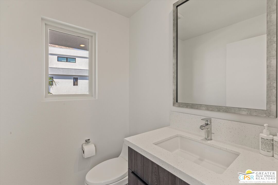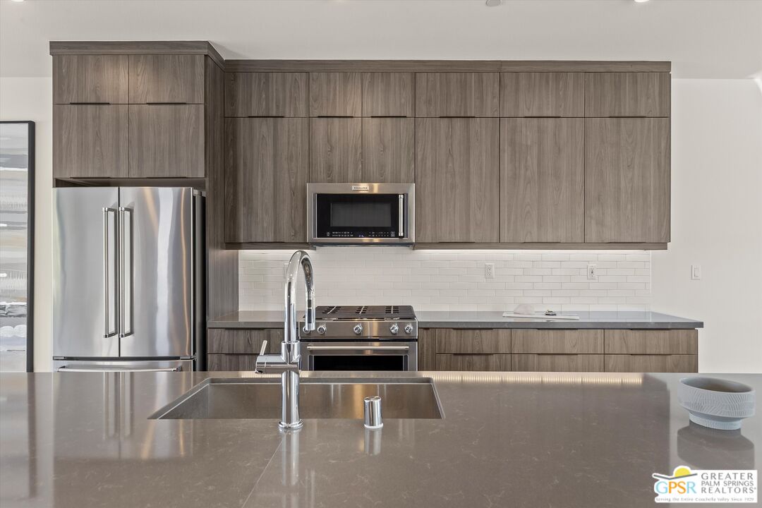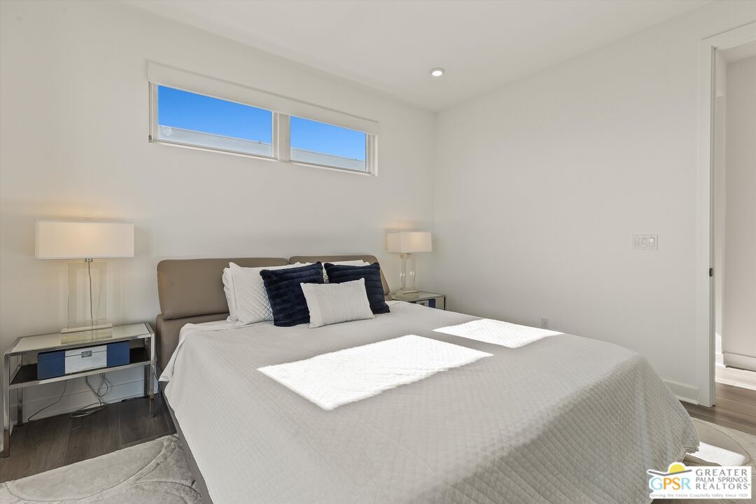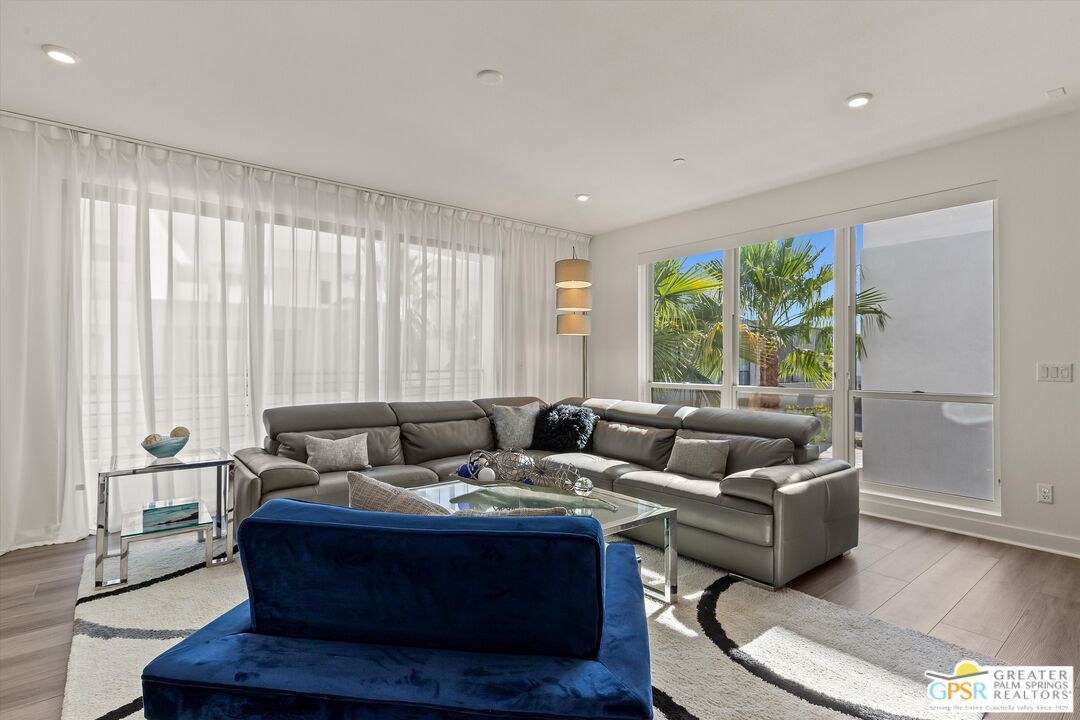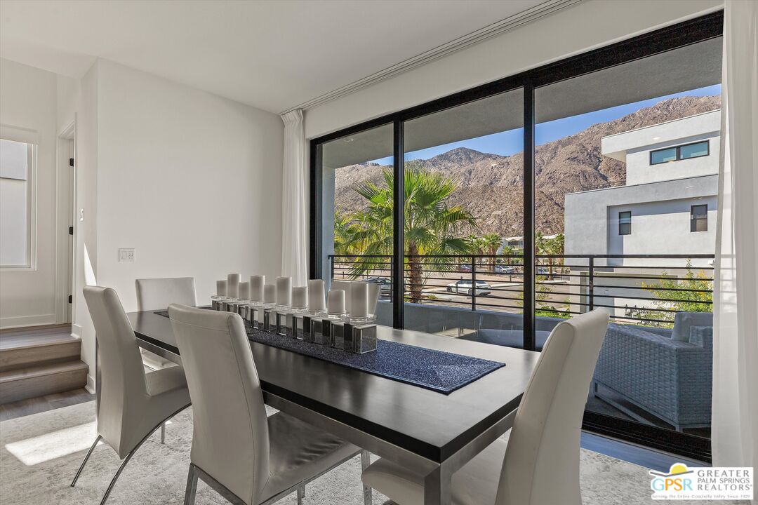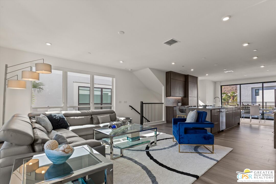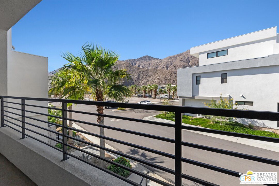 This stunning, highly upgraded condo in the desirable gated community of Cody Place offers the perfect blend of modern design and resort-style living; all framed by spectacular San Jacinto mountain views. As an end unit, this home is bathed in natural light with additional windows throughout, creating a bright, airy, and inviting atmosphere. The spacious great room and dining area are anchored by a gourmet kitchen featuring an oversized island, full-height cabinetry, stainless steel appliances, and quartz countertops with custom tile backsplash. Expansive sliding panel doors open to large covered balconies on both sides, seamlessly blending indoor and outdoor living and capturing breathtaking views from every angle. Upstairs, the primary suite serves as a private retreat with its own covered balcony and a spa-inspired bath with a generous walk-in closet. The upstairs den or office also opens to another covered balcony with unparalleled mountain and city views. The lower level features a private ensuite guest room with access to a secluded patio. Additional highlights include owned solar panels, porcelain tile and luxury vinyl plank flooring, and an attached two-car garage. Residents of Cody Place enjoy a beautifully designed clubhouse, two pools and spa, outdoor lounge and fire areas, BBQ, and a dog park; all within a secure, gated community that truly embodies Palm Springs resort living.